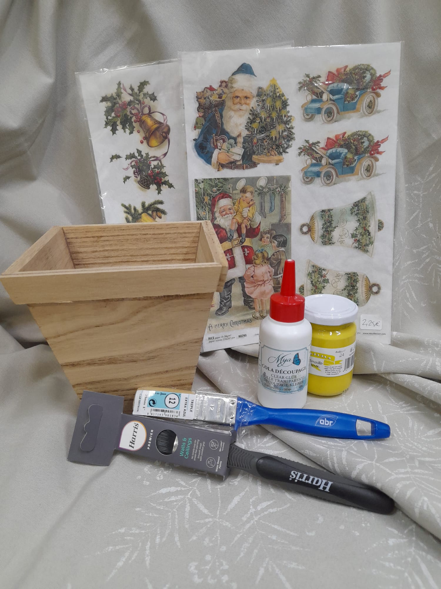 Con este kit tienes todo lo necesario para hacer decoupage navideño sobre una maceta de madera.