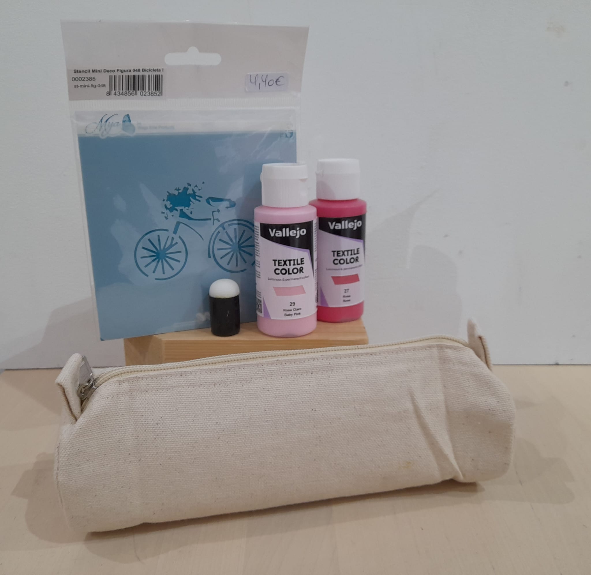 Con este kit tienes todo lo necesario para realizar un estarcido o stencil sobre un bonito estuche de tela.